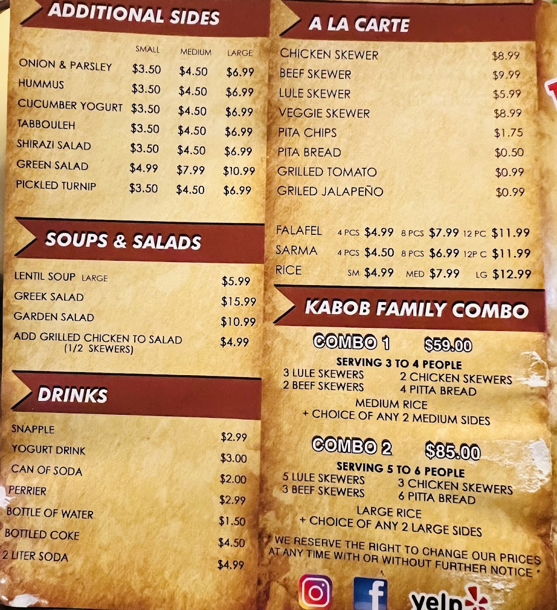 Two skewers of chicken kabob, two skewers of beef kabob, two skewers of lule kabob, one large rice, one hummus, one large salad and four pita bread, grilled tomato and jalapeno.