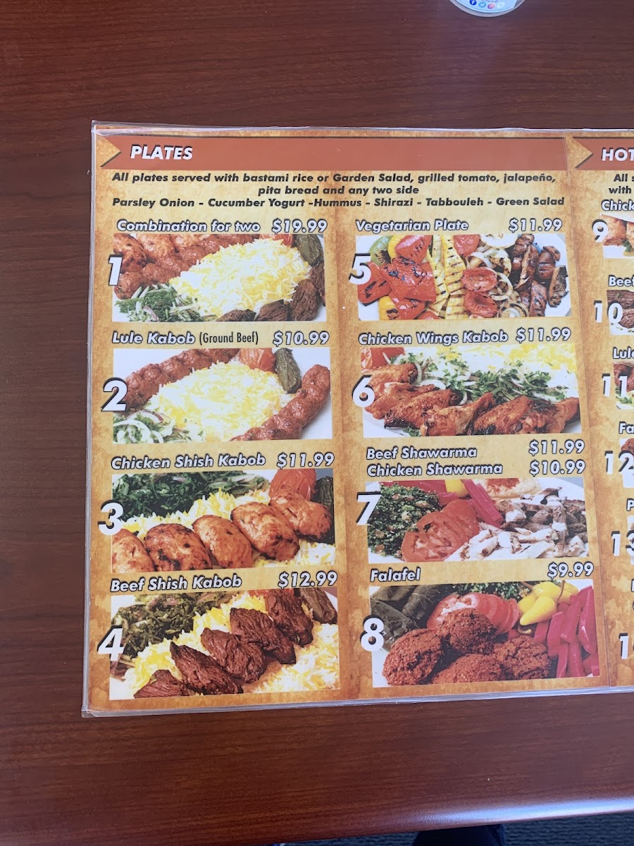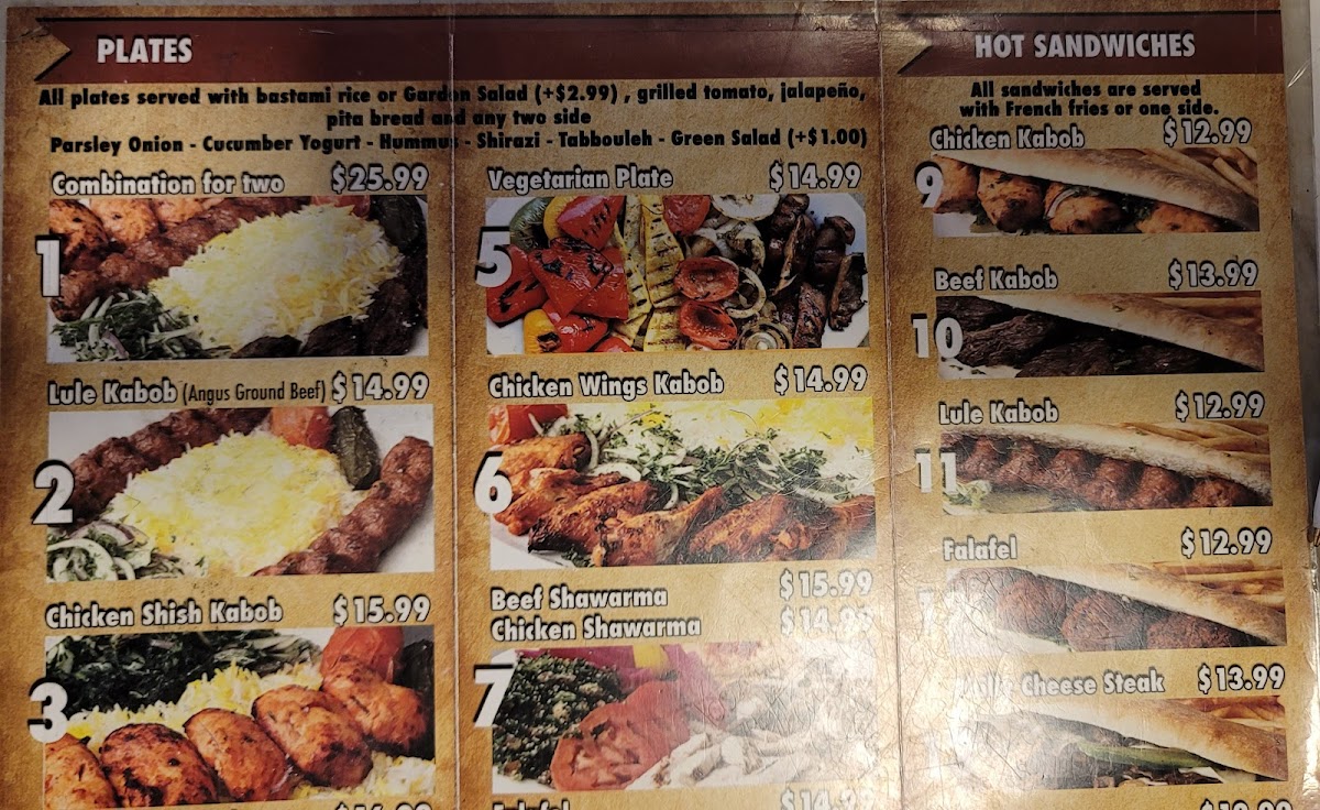 Three skewers of chicken kabob, three skewers of beef kabob, three skewers of lule kabob, one large rice, one hummus, one large salad and four pita bread, grilled tomato and jalapeno.